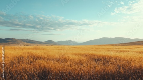 Golden Wheat Field Under Clear Blue Sky with Distant Mountains