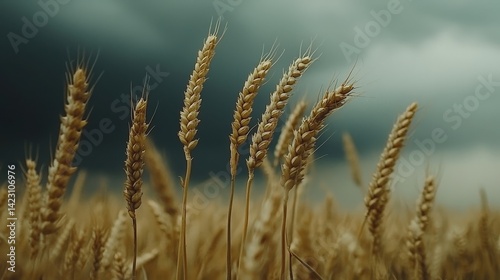 wheat, stalk, gold, grain, harvest, field, countryside, rural, landscape, nature, agriculture, crop, sunlight, cloud, storm, sky, dark, moody, weather, summer, autumn, season, ripe, ripened, growth, farming, fertile, dirtied, brown, beige, yellow, horizon, wind, breeze, abundance, organic, nourishment, food, bread, grain, ear, plant, vegetation, mature