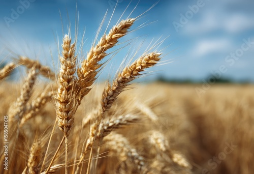 Golden wheat stalks stand tall against a vibrant blue sky, their ripe grains glistening in the sunlight, a vast field stretching to the horizon