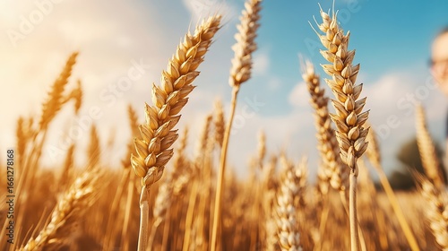Golden wheat stalks stand tall in a sunlit field, capturing the beauty of agriculture, This image is ideal for topics on farming, sustainability, and nature's bounty,