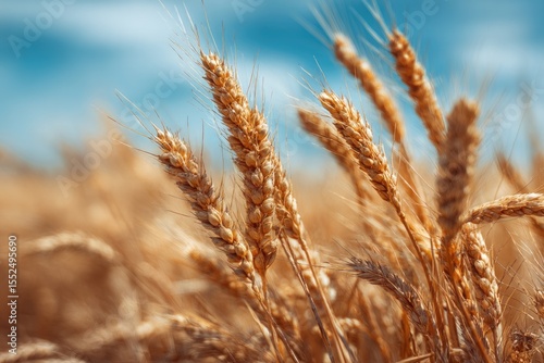 Golden wheat stalks sway gently in a sun-drenched field against a vibrant blue sky, showcasing ripe, heavy heads of grain ready for harvest