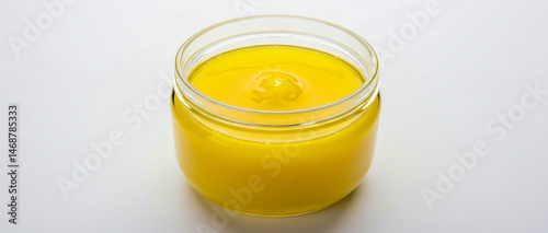 butter, cooking oil, fat, food, dairy product, yellow, gold, jar, transparent, closeup, isolated, white background, nourishment, cooking, ingredient, culinary, epicure, traditional, smooth, rich