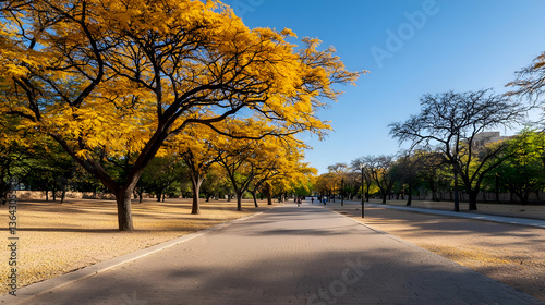 tree, path, autumn, landscape, sky, nature, yellow, road, daylight, park, scenic, alley, vibrant, paseo, foliage, light, shadow, tranquil, atmosphere, perspective, horizontal, season, colours, environment, gold, leaf, sunshine, clear, blue, urban, sun, tree, shadow, alleyway, journey, travel, natural, peaceful, pathway, stroll, background, serene, warm, high-coloured, orange, bright, calm