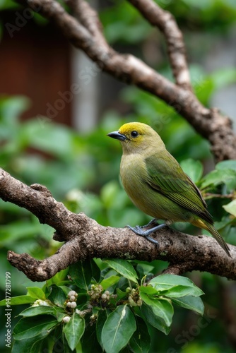 bird, green, yellow, foliage, tree branch, tree, nature, wildlife, photo, avian, tropical, natural, serene, vibrant, gem, colours, plumage, fauna, ecosystem, habitat, perched, sitting, image, picture, photo, visual, artistic, beauty, elegant, exotic, bright, commercial, stock, birding, zoology