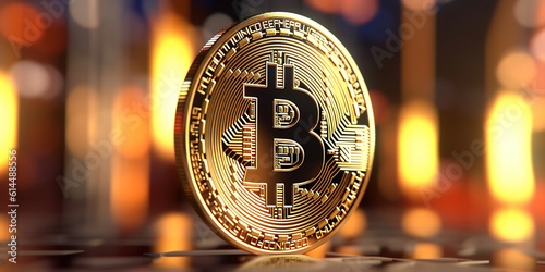 Goldene glänzende Bitcoin Münze im Licht und Schatten mit schönen Hintergrund, ai generativ