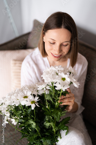Good looking Caucasian woman enjoy flowers, she is happy to get a fresh bouquet of white chrysanthemum while relaxing on the sofa