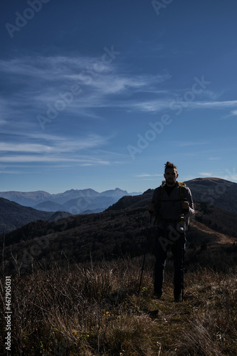Good weather and tourists walk along famous trail in reserve. Caucasian young male traveler walks through mountains with large backpack and enjoys views of nature.
