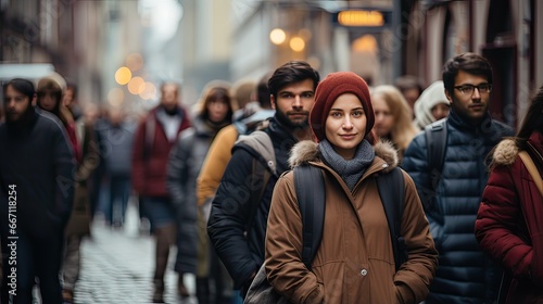 Gorgeous girl with people walking in the city center in winter
