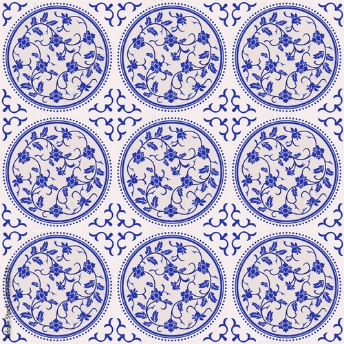 Gorgeous seamless pattern of Chinese tiles. Floral stylish background in shades of blue