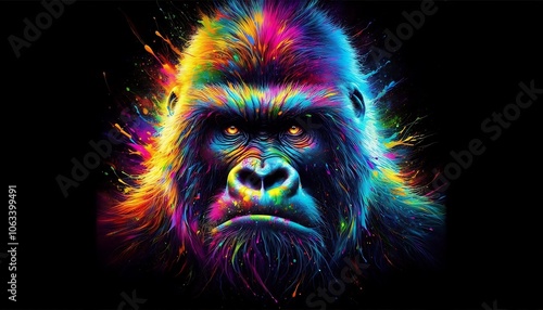 Gorilla, abstract neon portrait of gorilla cartoon with dazzling rainbow lights, black background