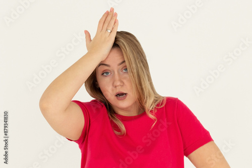Gosh why me. Portrait of unhappy annoyed young arrogant woman in red top facepalming with irritation breathing out with opened mouth and rolling eyes from annoyance and exhaust