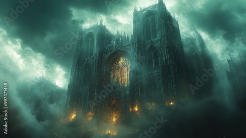 cathedral, gothic, architecture, mist, cloud, sky, stone, window, dark, fantasy, mystery, building, religious, old, ancient, tall, grand, tower, church steeple, masonry, ornate, structure, fog, haunted, eerie, gloomy, creepy, shadowy, silhouette, dreamy, enchanting, magical, atmospheric, dramatic, green, teal, night, dawn, light, glow, gold, ray, moon, storm, cloud, nature, landscape, winter, lightning