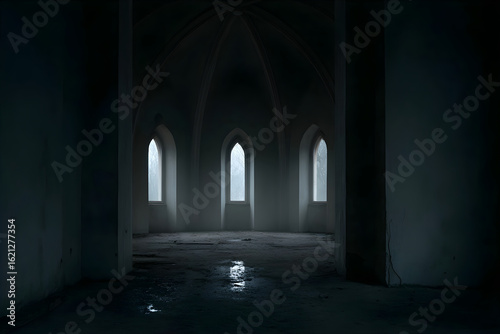 Gothic room with arched window. Creepy abandoned church interior. Mysterious spooky building. Scary abstract backdrop. Dark horror atmosphere.
