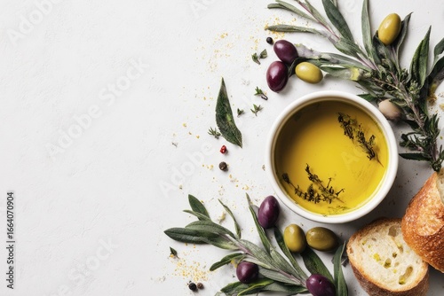 olive oil, olive, herb, bread, food, ingredient, kitchen, cooking, fresh, healthy, delicious, natural, tasty, epicure, spice, garlic, basil, thyme, rosemary, oregano, lemon, pepper, salt, sesame, wheat, flour, rustic, white, bowl, topping, drizzle, widener, topview, background, light, grey, stone, surface, closeup, detail, composition, design, modern, stylish, simple, quality, organic