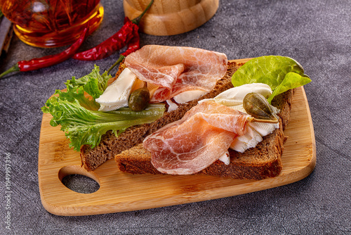 Gourmet open-faced sandwich with prosciutto, soft cheese, and capers on rye bread.