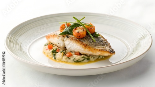 seafood, fish, seabass, epicure, fine dining, eatery, cookery, dish, food, meal, plate, white plate, risotto, creamy, grain, cherry tomato, tomatoes, vegetable, garnish, herb, chives, cooked, main course, healthy, delicious, tasty, flavorful, presentation, food photography, studio shot, white background, culinary, gastronomy, preparation, ingredient, fresh, organic, nourishment, lunch, dinner, light meal