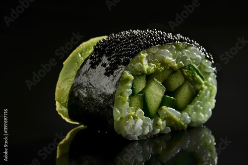 sushi, caviar, epicure, vegetarian, cucumber, avocado, elegant, cookery, dark, background, closeup, sophisticated, food, japanese, traditional, rice, seaweed, black, green, fresh, culinary, artistry, dining, raw, edible, delicious, exotic, minimalist, fusion, healthy, snack, decorative, stylish, premium, high-end, artistic, appetising, upscale, luxury, refined, intricate, fancy, modern