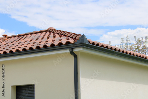 Gouttière aluminium gris anthracite, enjoliveur nuage d'angle extérieur, sur la façade de la maison, descentes rectangulaires et lambris de sous-face en pvc blanc