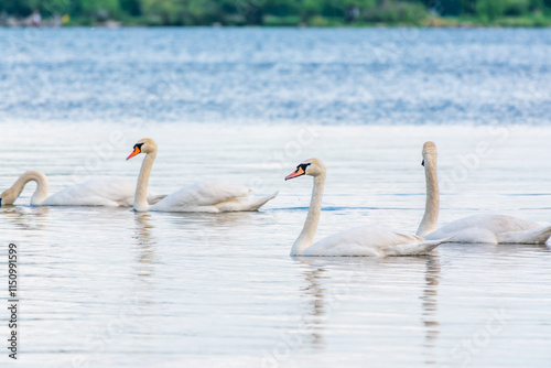 Graceful white Swans swimming in the lake, swans in the wild