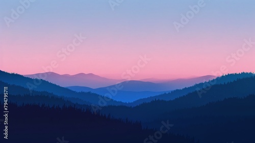 Gradients of dawn or dusk skies, capturing the serene moments of daybreak or twilight. Layered mountain landscape at dawn with mist