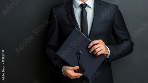 graduate, cap, suit, graduation, ceremony, achievement, success, education, student, formal, college, university, diploma, celebration, future, professional, opportunity, cognition, learning, wisdom, growth, career, ambition, accomplishment, pride, joy, hope, aspiration, black, grey, dark, attaching, hand, attire, man, person
