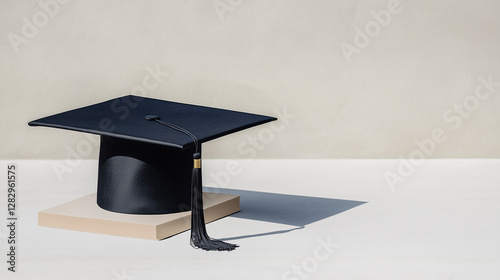 Graduation Cap on Plinth: A classic black graduation cap with a tassel rests atop a small wooden plinth, casting a subtle shadow.