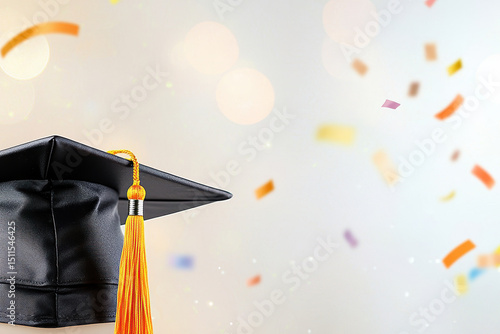 Graduation cap with confetti in celebratory atmosphere, symbolizing achievement and joy