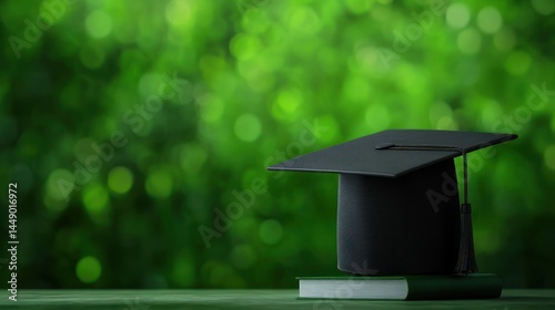 Graduation mortarboard resting on a book in academic environment with green backdrop