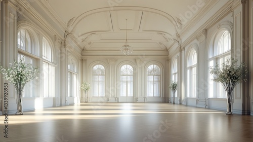 ballroom, interior, architecture, window, sunlight, elegant, classic, luxurious, grand, white, wall, hardwood, floor, design, photo, room, space, building, bright, light, hall, palace, estate, luxury home, home, house, decor, style, aesthetic, formal, event, wedding, ceremony, reception, sophisticated, ornate, decorative, classical, residential, arch, corridor, church, door, column, stone, cathedral, religion, arch