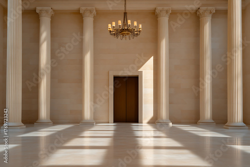 Grand hall with stately columns, a classic chandelier, and warm sunlight casting shadows across the polished floor, evoking timeless elegance and architectural grandeur.