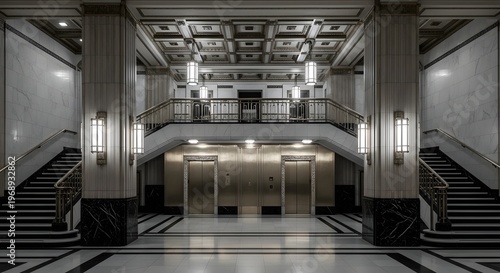 Grand Interior of a Classic Building Lobby with Marble and Elevators