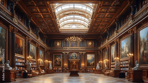 library, grand, ornate, decor, painting, classical, bookshelf, book, chandelier, gold, wooden, ceiling, arch, statue, sculpture, antique, vintage, interior, room, architecture, historical, elegant, luxurious, old book, bookshelf, art, old world, historical building