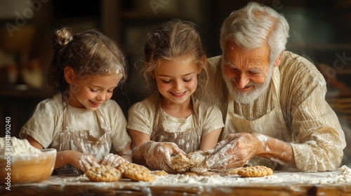 Grandfather and two girls baking cookies together in a cozy kitchen.