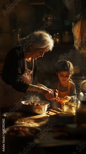 grandmother, granddaughter, cooking, kitchen, food, family, love, tradition, elderly, children, happy, together, preparing, meal, receipe, ingredient, oven, stirring, hand, warmth, home, care, connection, generation, support, domestic, old, young, time, healthy, nourishment, delicious, tasty, baking, concentrated, focused, skilful, fresh, comfort, rustic, aged, autumn, passion, simple, beautiful, joyful, togetherness