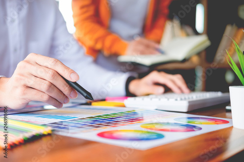 Graphic design partners working together renovation and technology concept - on a desktop computer and selection using some color swatches