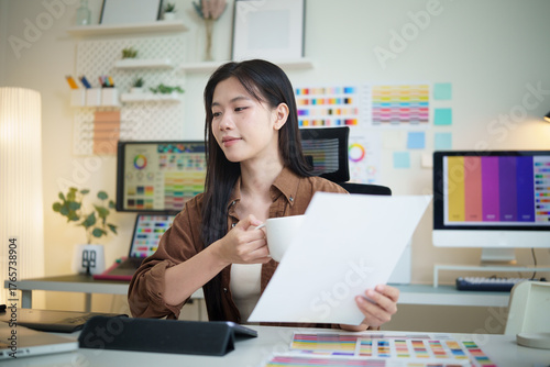Graphic designer analyzing color samples and design layouts in modern workspace.