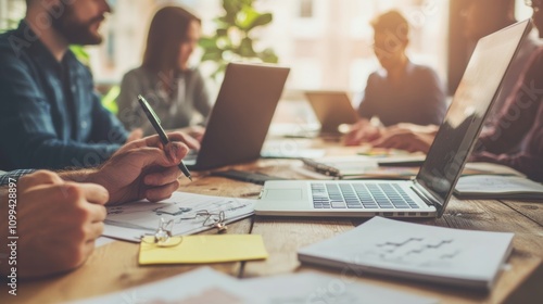 Graphic designer work on computer laptop and with graphic drawing pen while brainstorming unique design with professional graphic team in modern digital studio workplace.