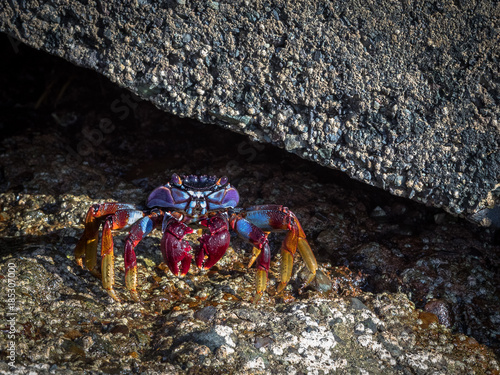 Grapsus adscensionis - red rock crab, standing on a rock in Puerto Rico, Gran Canaria, Spain