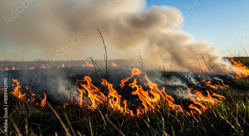fire, grass, burning, smoke, flames, heat, wildfire, nature, field, outdoors, landscape, sky, summer, dry, hazard, danger, environmental, rural, ground, vegetation, blaze, combustion, warm, growth, destruction, control, agriculture, season, horizon, afternoon, clearing, sunlight, atmosphere, ecosystem, conservation, management, prescribed, land, terrain