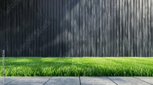 Grass on black wooden wall background in house yard. Lawn near fence.