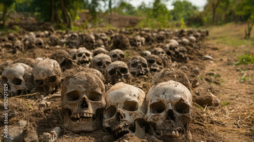 Graveyard of skulls in a desolate landscape symbolizing loss and mortality amidst nature's tranquility