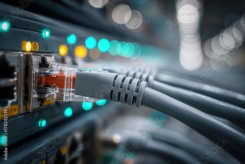 Gray ethernet cables connected to glowing data server ports