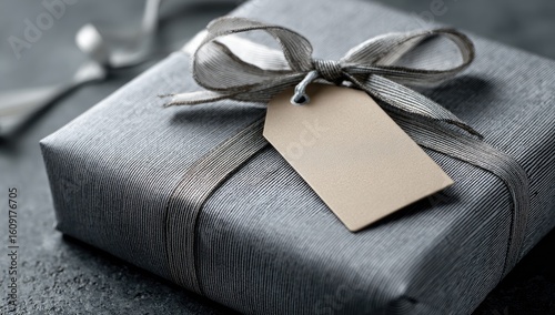 gift, box, present, grey, ribbon, tied, bow, tags, blank, neutral, muted, wrapping, paper, decor, elegant, simple, thoughtful, celebration, occasion, festive, holiday, special, special occasion, subtile, textured, quality, hand-made, rustic, modern, sophisticated, classic, practical, stylish, chic