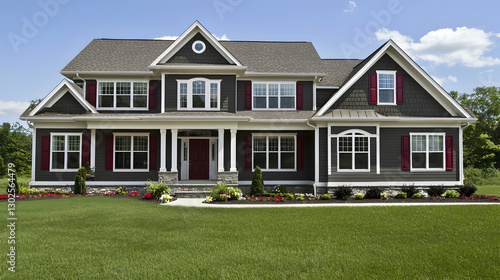 house, home, real estate, architecture, residential, property, building, exterior, design, grey, burgundy, white, window, roof, lawn, landscape, front, yard, garden, flower, two-story, column, shutter, door, luxury home, new construction, for sale