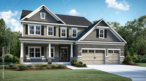 house, home, exterior, residential, architecture, real, estate, building, property, design, grey, stone, two-story, window, roof, garage, lawn, landscaping, front, view, modern, family, luxury, dream, suburban, new, photo, architectural, for, sale, construction