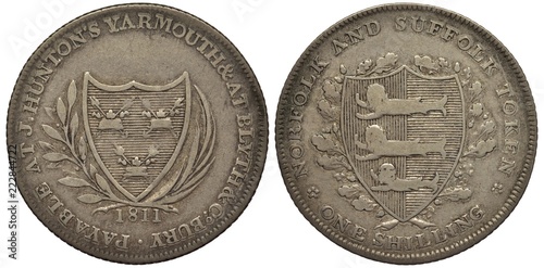 Great Britain British Norfolk and Suffolk silver coin token 1 one shilling 1811, shield with stripes flanked by sprigs, payable at J.Hunton’s Yarmouth, Blyth and Canterbury, shield with lions flanked