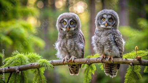 Great Grey Owlets perched on a tree branch in the lush boreal forest of British Columbia , Owlets, Great Grey Owl, wildlife, nature