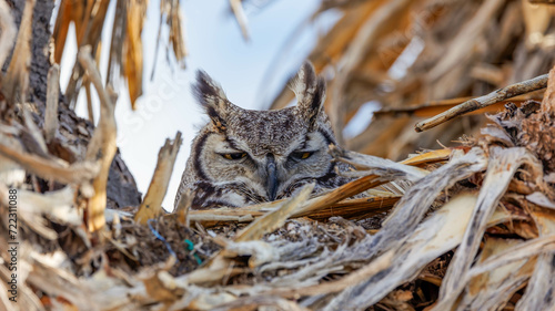 great horned owl resting in nest