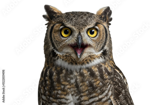Great horned owl with yellow eyes, transparent background