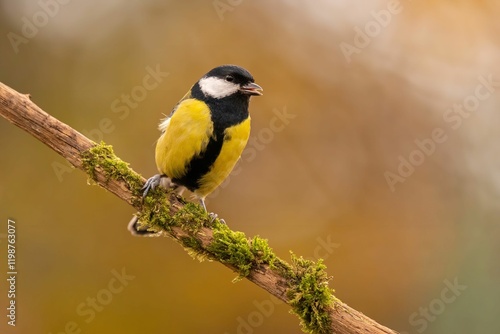 Great Tit on Mossy Branch: A Vibrant Autumn Portrait
